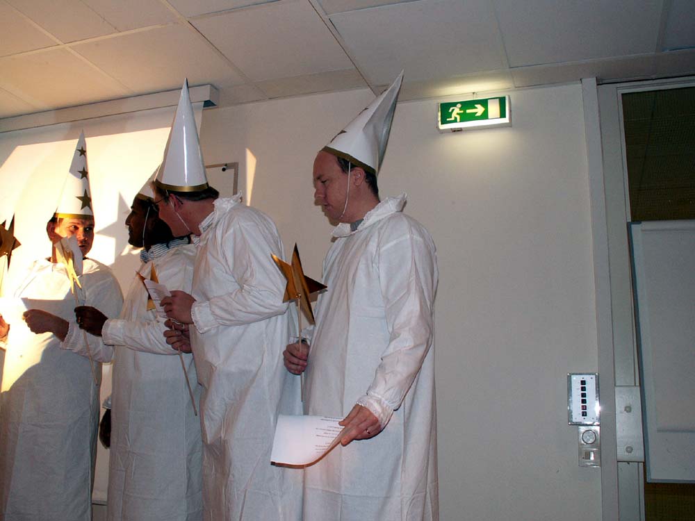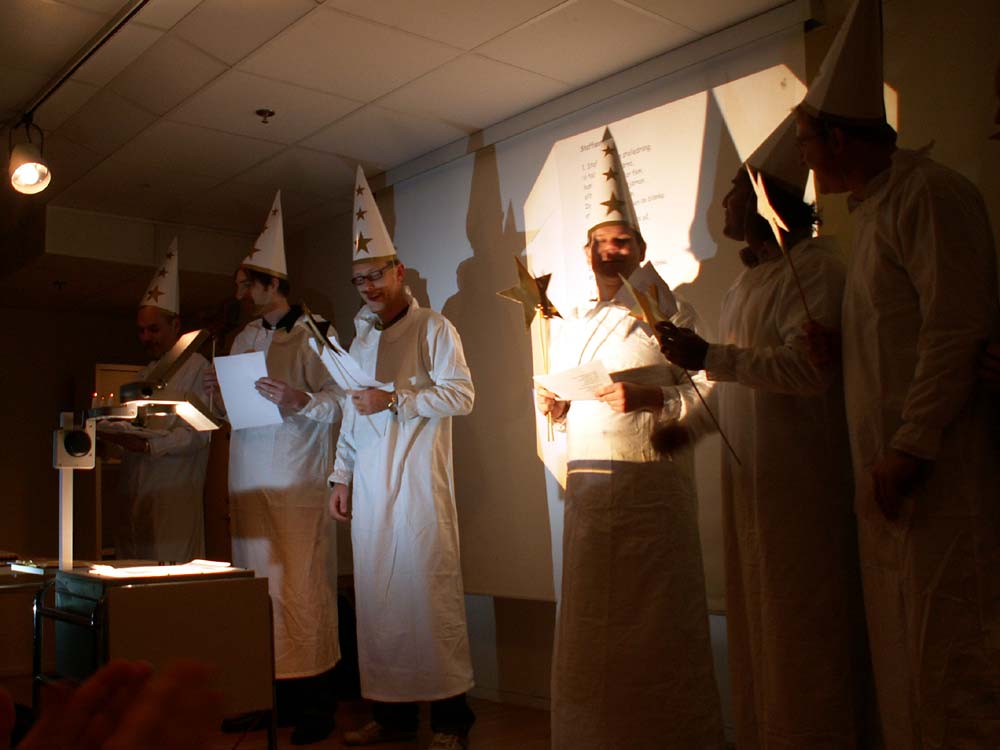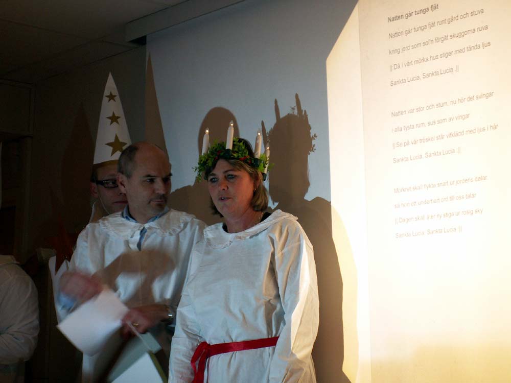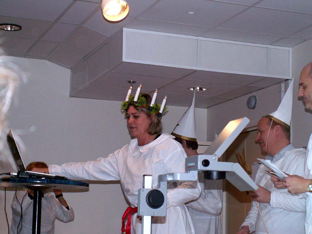 Tyvärr var inte bakgrunden med diaprojektor, filmduk och glaspartier helt idealiska, men trots detta kanske det går att förmedla den glädje som spreds vid fredagens Luciafirande.