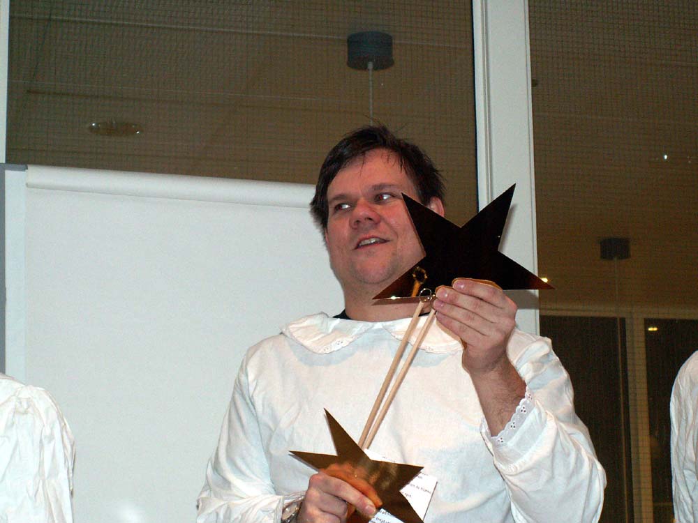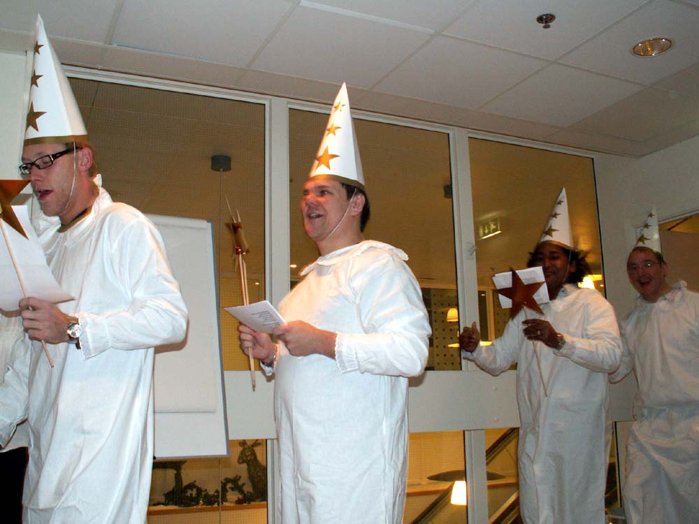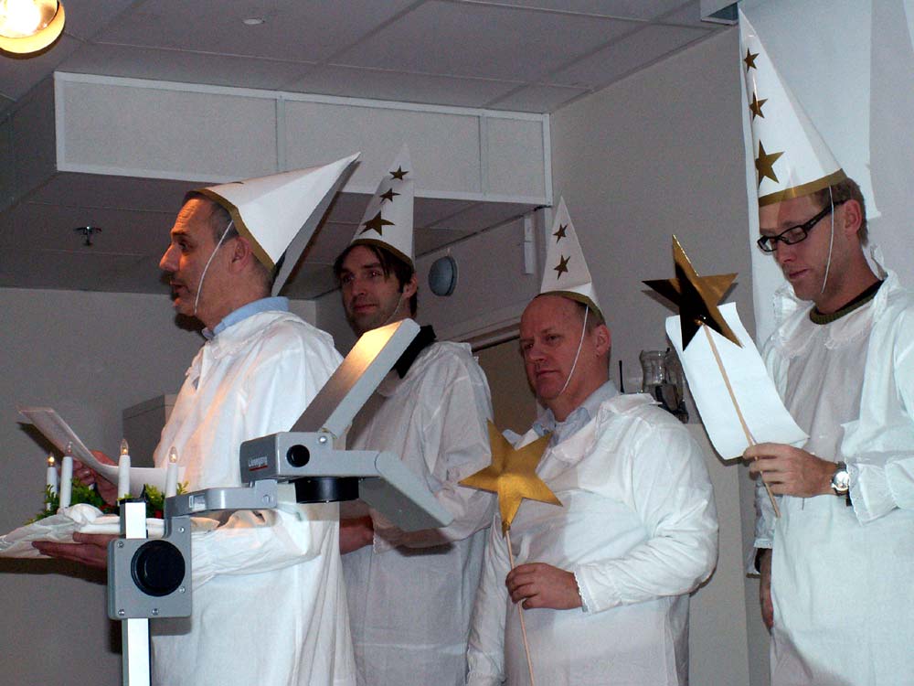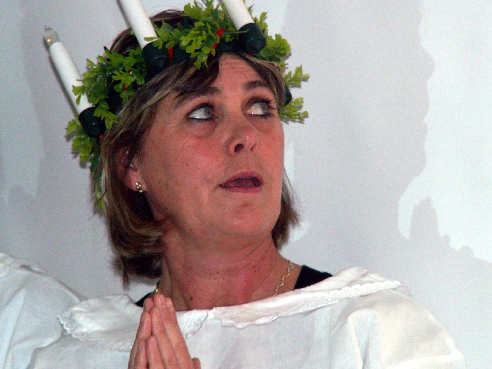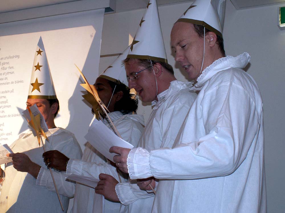Tyvärr var inte bakgrunden med diaprojektor, filmduk och glaspartier helt idealiska, men trots detta kanske det går att förmedla den glädje som spreds vid fredagens Luciafirande.